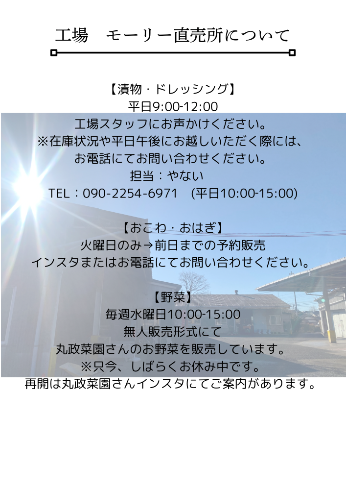 おいしいと笑顔あふれる「モーリーマーケット」定期開催中!工場へ直接購入希望の方はお電話にてお問い合わせください。